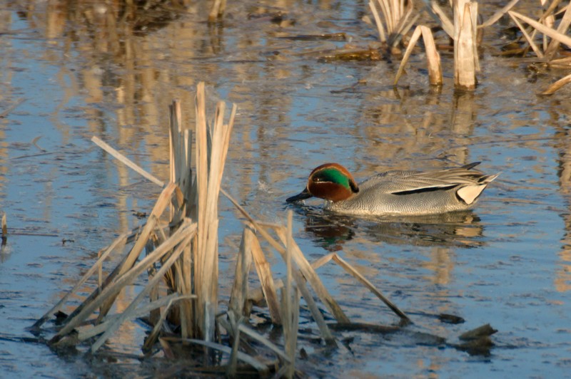 La semana pasada se podían ver unas cuantas cercetas comúnes, es un pato muy vistoso en el caso de los machos, por la coloración. La cabeza es de un